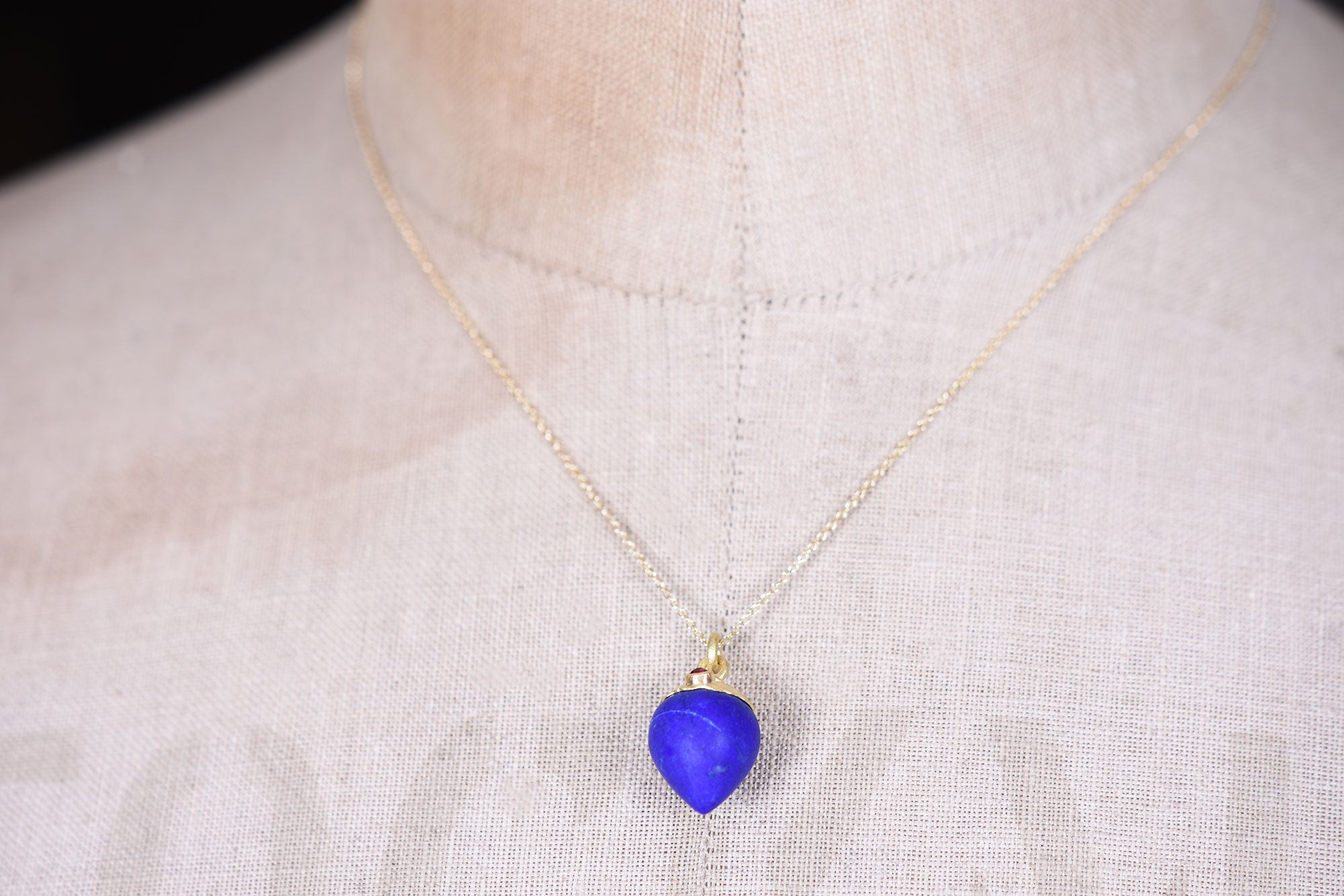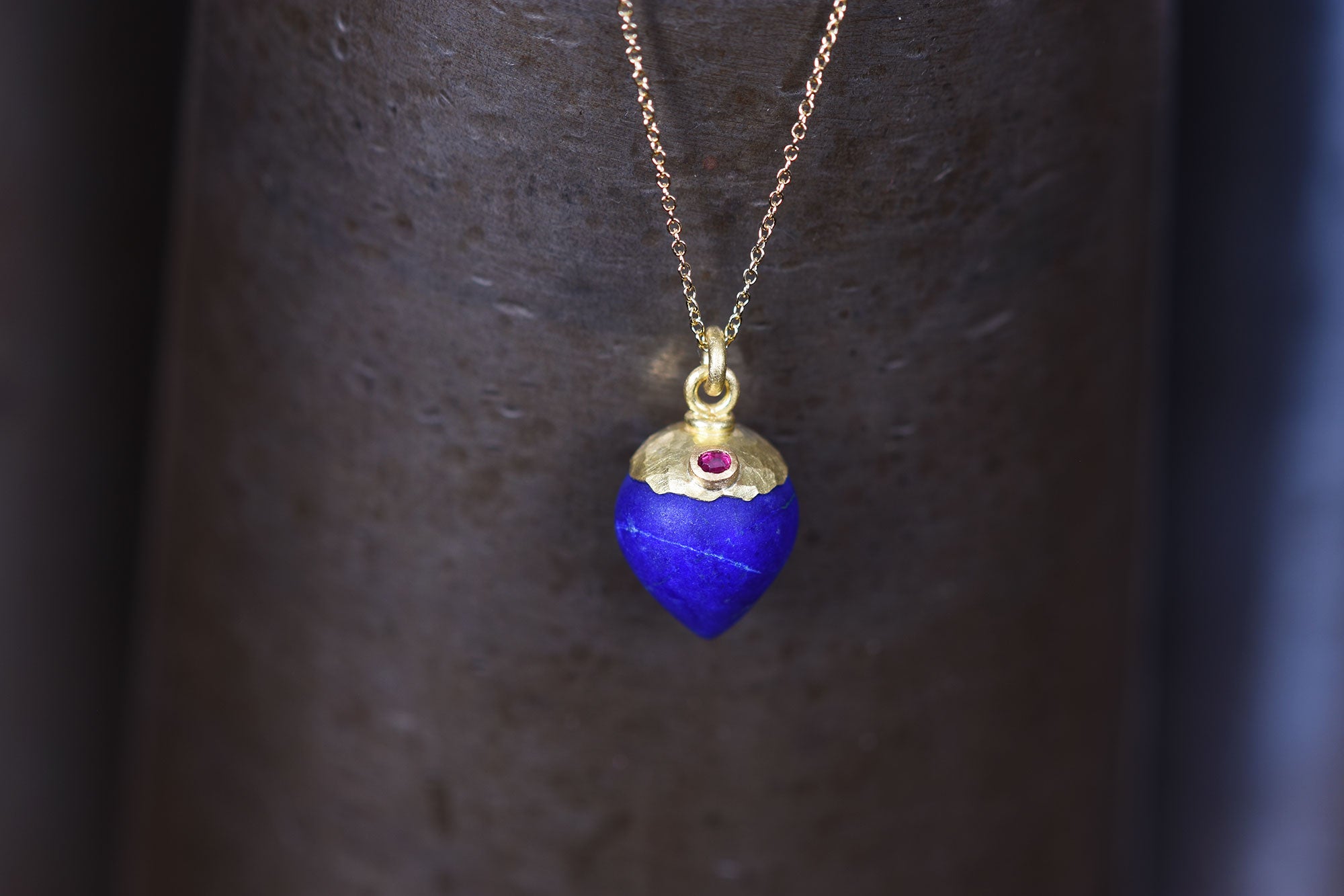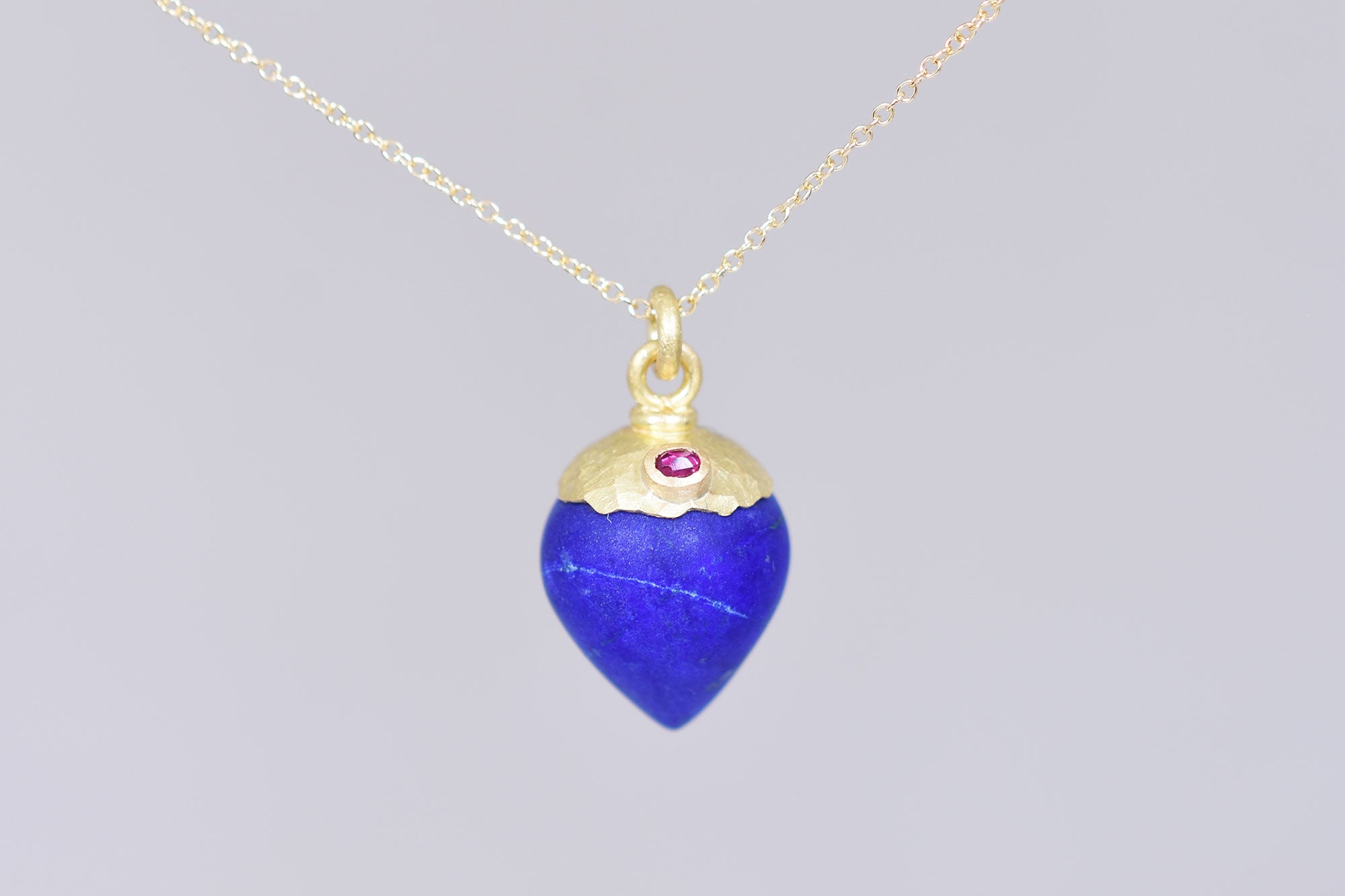 This Lapis Lazuli drop pendant is set in hammered satin 18ct yellow gold, it has an oval cut ruby set on the top and hangs from an 18ct yellow gold fine trace chain.