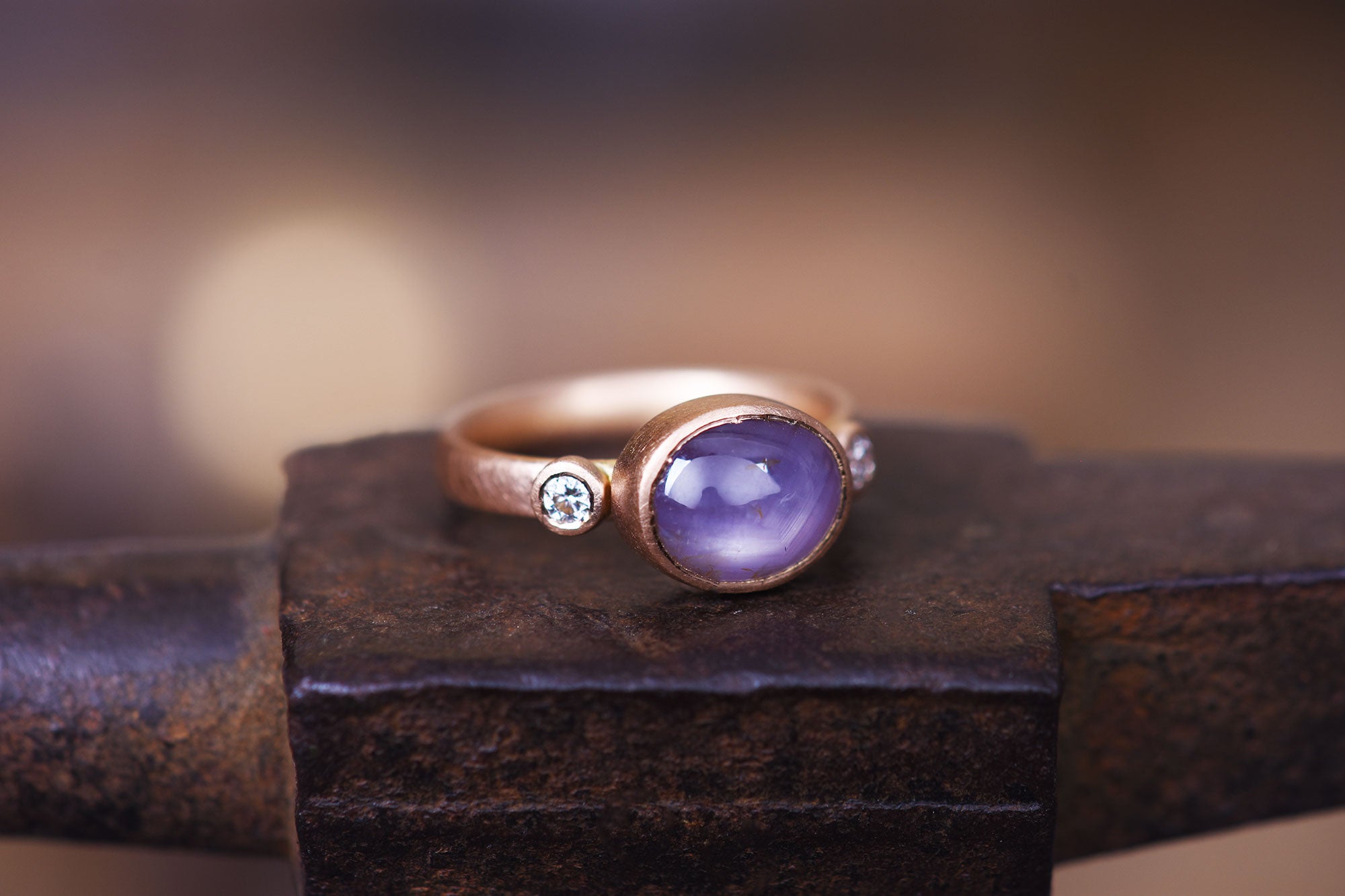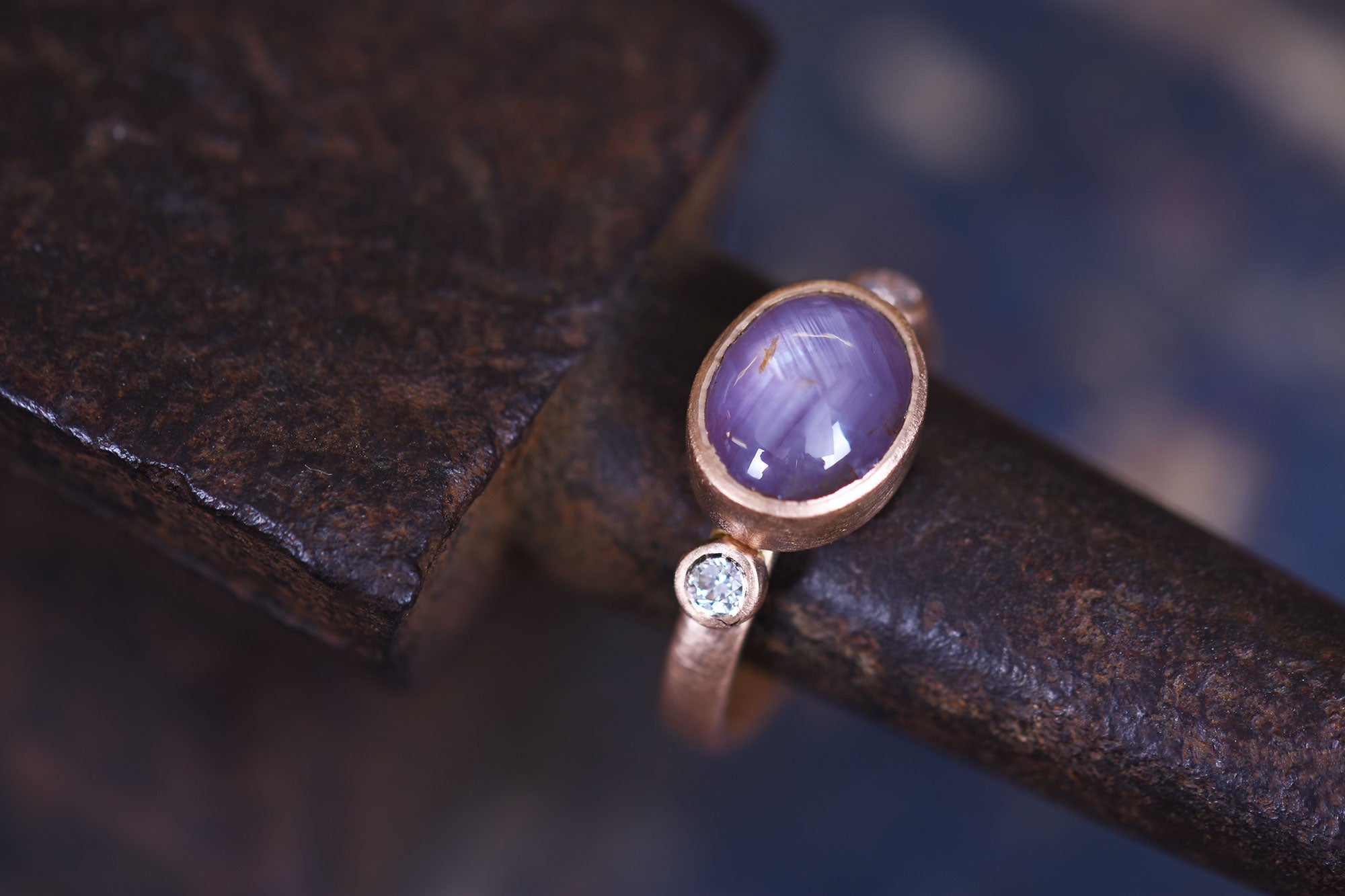 This three stone ring features an oval purple star sapphire with two round brilliant cut diamonds either side, all set in unpolished 18ct rose gold.